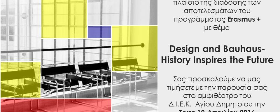 Με απόλυτη επιτυχία υλοποιήθηκε το ευρωπαϊκό πρόγραμμα «Design and Bauhaus: History inspires the Future» στο Βερολίνο στο πλαίσιο του ERASMUS+ από 11 Ιανουαρίου μέχρι και 25 Ιανουαρίου 2016 με τη συμμετοχή των σπουδαστών της ειδικότητας «Εσωτερική, Αρχιτεκτονική Διακόσμηση και Σχεδιασμός Αντικειμένων» του Δ.ΙΕΚ Αγίου Δημητρίου.