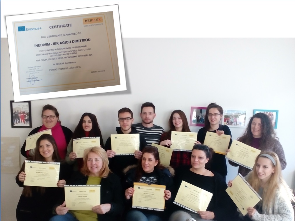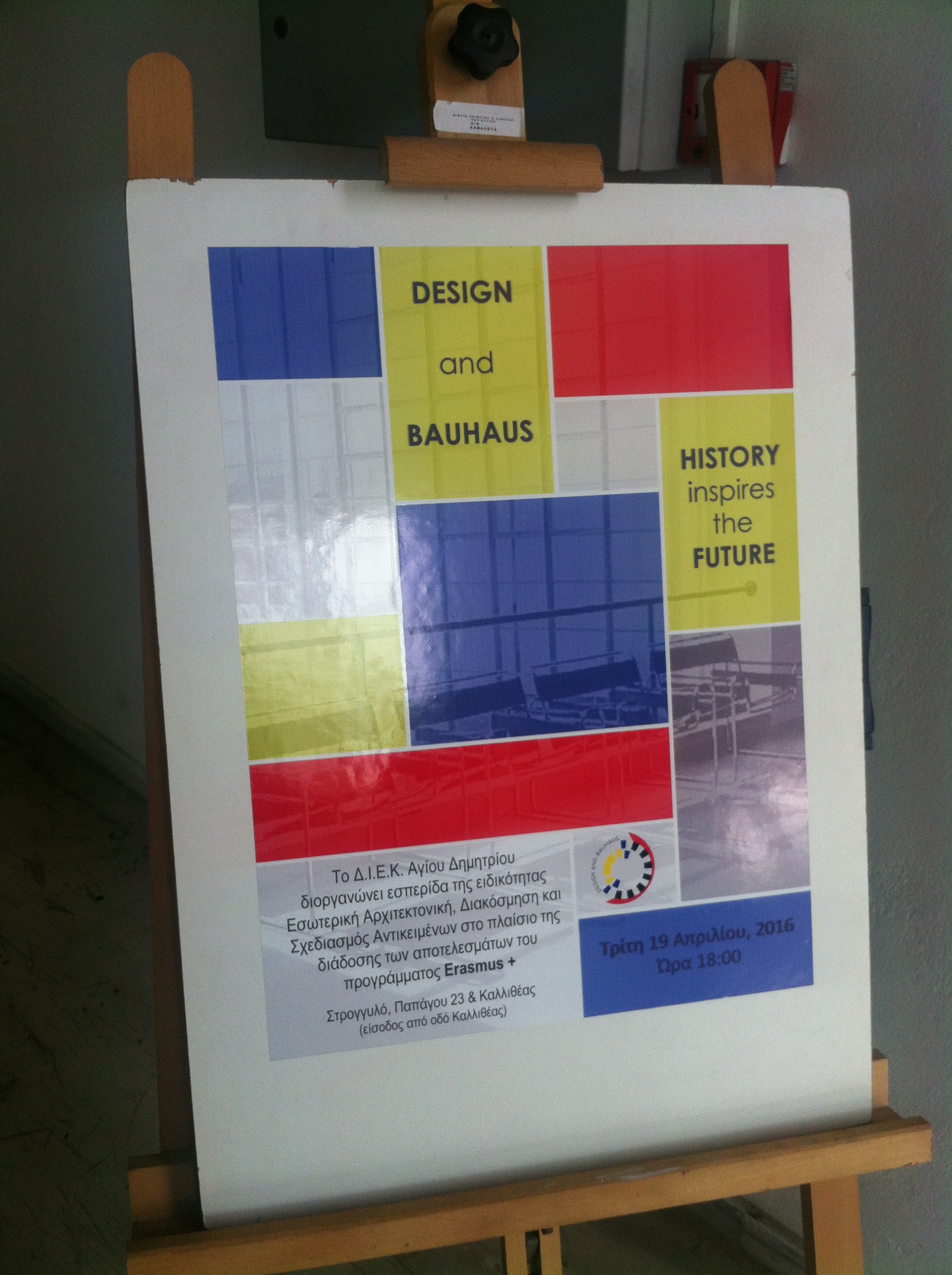 Με απόλυτη επιτυχία πραγματοποιήθηκε η εσπερίδα στο πλαίσιο της υλοποίησης του ευρωπαϊκού προγράμματος ERASMUS+ με θέμα: «Design and Bauhaus: Ηistory Inspires the Future» που διοργάνωσε το Δ.ΙΕΚ Αγίου Δημητρίου την Τρίτη 19 Απριλίου 2016 για την διάδοση των αποτελεσμάτων στην τοπική κοινότητα και την ευρύτερη κοινωνία.