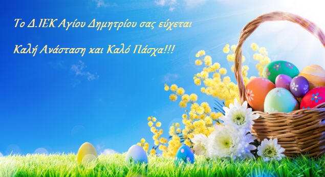 09/04/2017ΙΕΚ ΑΝΑΚΟΙΝΩΣΗ Σας ενημερώνουμε ότι θα γίνει διακοπή των μαθημάτων, λόγω των εορτών του Πάσχα από 10 μέχρι 21 Απριλίου 2017. Τα μαθήματα θα ξεκινήσουν κανονικά την Δευτέρα 24 Απριλίου 2017, σύμφωνα με το Ωρολόγιο Πρόγραμμα.